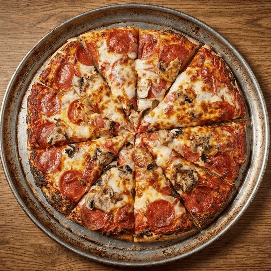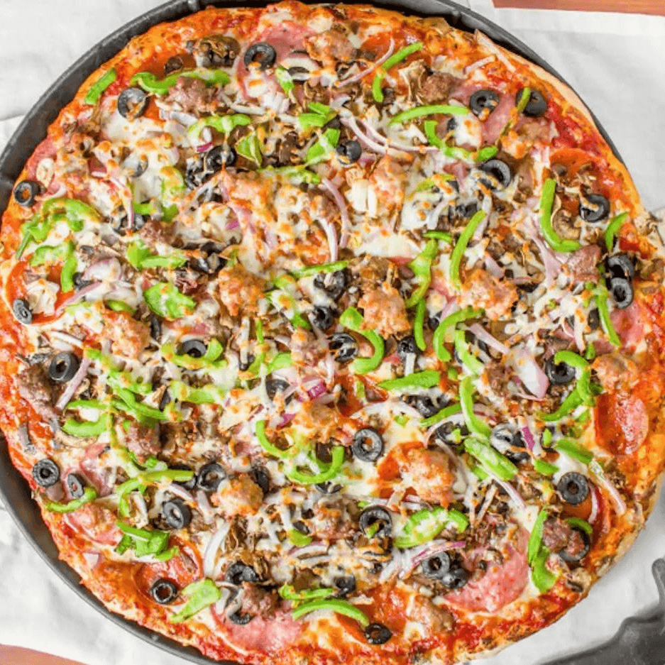 Pepperoni, salami, bell peppers, fresh mushrooms, sliced black olives, red onions, ground beef, & Italian sausage with our homemade pizza sauce.
