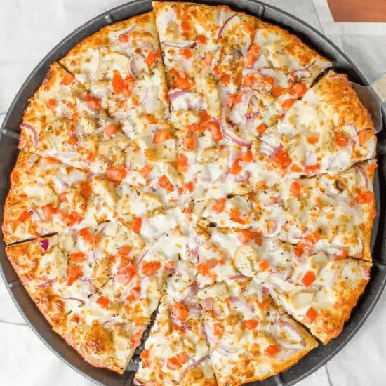 White sauce, mozzarella cheese, crushed red peppers, pepperoni, mushrooms, red onions, bacon, jalapeno, sausage.