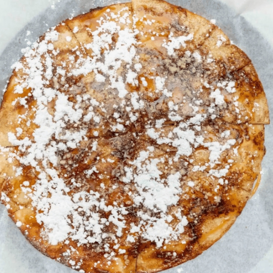With butter, brown sugar, cinnamon and topped with caramel and powdered sugar. Medium 12"